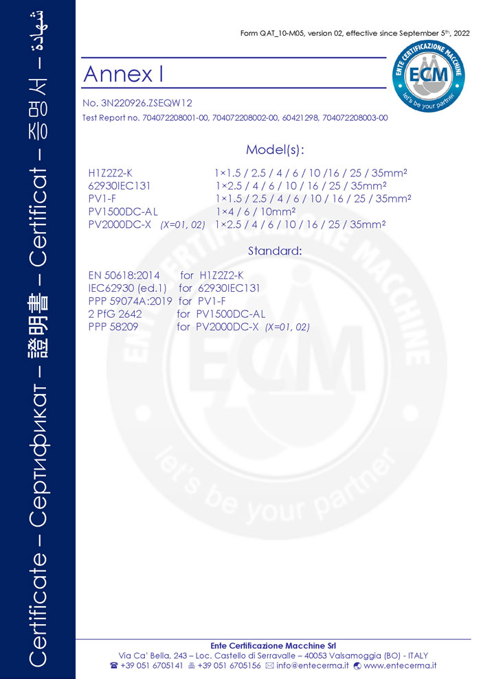 Вся продукция производится в строгом соответствии со стандартами IEC, EN, TÜV и UL, что обеспечивает долгосрочную безопасность, эффективность и долговечность систем солнечной энергии.